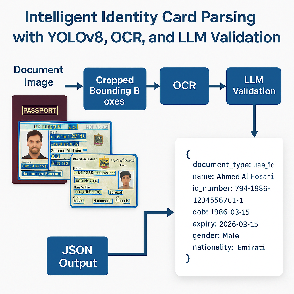 In today’s digitally driven landscape, automating ID data extraction from documents such as passports and other ID cards is vital for sectors like banking, travel, and government. PIT Solutions has developed a comprehensive, end-to-end AI-powered pipeline that captures essential information from images of identity cards – specifically UAE passports and UAE ID cards – and delivers the output as structured JSON objects, making it suitable for integration with downstream systems.