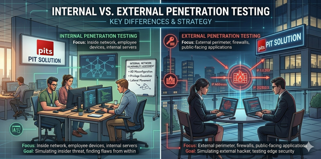 At PIT Solutions, our cybersecurity team works with organizations across industries to deliver continuous vulnerability assessments and managed SOC services that go far beyond a one-time test. In this blog, we break down internal vs. external pen testing - so you can make an informed decision about what your business truly needs.