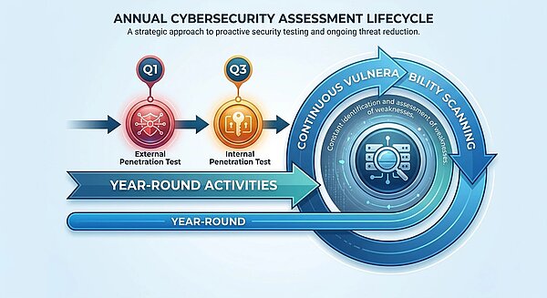 A combined annual testing cycle may include: an external pen test in Q1 to assess perimeter defenses after year-end changes, an internal pen test in Q3 to validate internal controls, and continuous vulnerability scanning year-round to catch newly disclosed CVEs before attackers do. To learn more about how a fully managed approach can complement your testing program, explore Managed Cybersecurity Services for business protection by PIT Solutions.