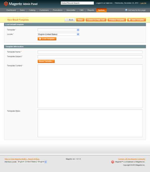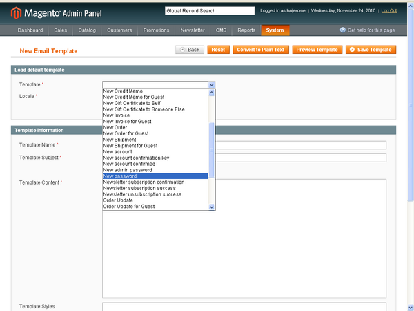 6. Now click on “Load Template” and you can see the template subject, template content and template styles. Make necessary changes to your template as you wish and give your template a name. For example if you want to change the magento Email Logo. Just Copy your New Email Logo to the default skin\frontend\default\default\images location and replace the default magento logo ‘logo_email.gif’ with your new email logo file name lets say ‘mystore_logo_email.png’. In this case “MyStore New Password” and preview the template if it looks good for you then go ahead and save the template as “mystore new password”.