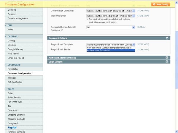 8. Then Go to System -> Configuration -> Customer Configuration. Click on the “Password Options” and assign our new email template “mystore new password” as an email template for forgot password. And we can also choose the Email Sender too from the drop down last for Forgot Password emails.