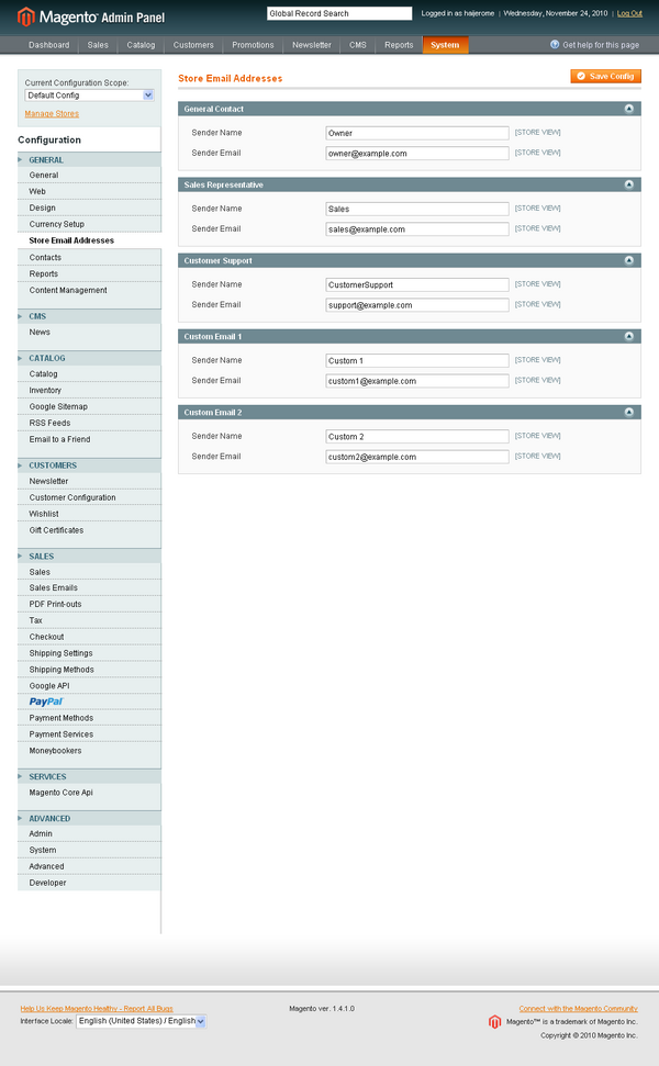 7. Its not over yet. So far we have created only a new email template for “forgot Password”. Still we have to assign this as the Forgot Email template instead of the default magento email template and change the email configurations. Lets see what we have to still to get our new email email template for forgot password. Click on both the links “Configuration” and “Customer Configuration” to change the Magento Email settings. At first let us see what we have to change in configuration. Go to System -> Configuration -> Store Email Addresses and change the email addresses for the General, Customer support etc.
