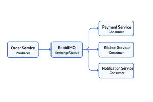 Advantages: If the kitchen service is temporarily unavailable, the “OrderPlaced” message remains in the queue until it can be processed. During peak hours, RabbitMQ buffers incoming messages to prevent service overload. Additionally, each service can be scaled independently, such as adding more kitchen service instances during busy meal times, without affecting the others.