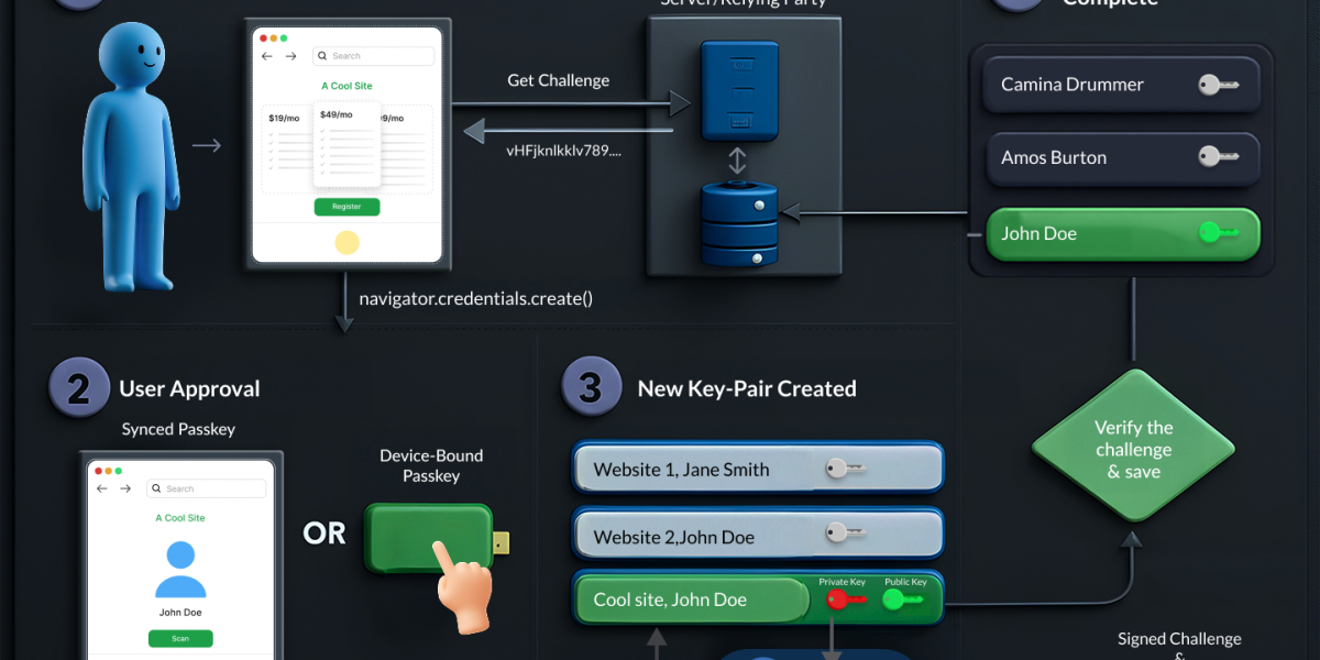 When you create an account with a passkey (or add one to an existing account), your device creates a public-private key pair. The public key is then handed over to the server against which the key is being created. The private key is stored by the user’s device, and bound to the domain name where it has been created. The storage medium could range from an encrypted web-based store, hardware-backed local device store, or even dedicated plug-and-play hardware. The last stated option is overkill for most users, but it is available and provides the highest level of compromise-proof security. The key creation process will also include a verification to make sure the generated key works properly.