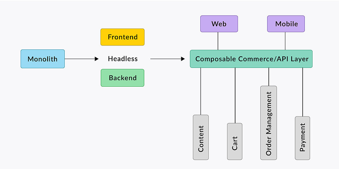 Die MACH-Architektur bildet die Grundlage des Composable Commerce. Die Headless-Architektur, ein wesentlicher Bestandteil von MACH, stellt den ersten Schritt auf dem Weg zum Composable Commerce dar.