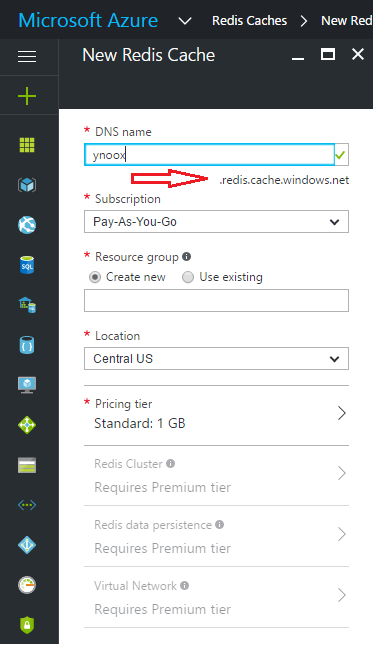 Next you will need to first select a name (DNS name) that is unique. The resource group your cache will belong to, and the location. You should strive to select a location that is in the same region as the services that will use the cache for best performance. The DNS name for your cache will be {cache name}.redis.cache.windows.net.