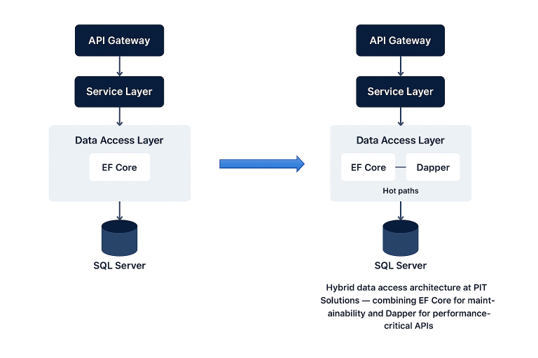 PIT Solutions optimized high-throughput APIs by blending EF Core’s efficiency with Dapper’s speed—achieving up to 60% faster execution and reduced memory usage through a balanced hybrid architecture.