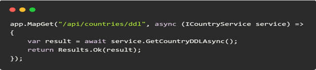 We maintained multiple lookup endpoints—for countries, departments, insurance providers, etc.—each with a near-identical controller setup. It was excessive. With .NET 8 Minimal APIs, these were reduced to a single, readable line:
