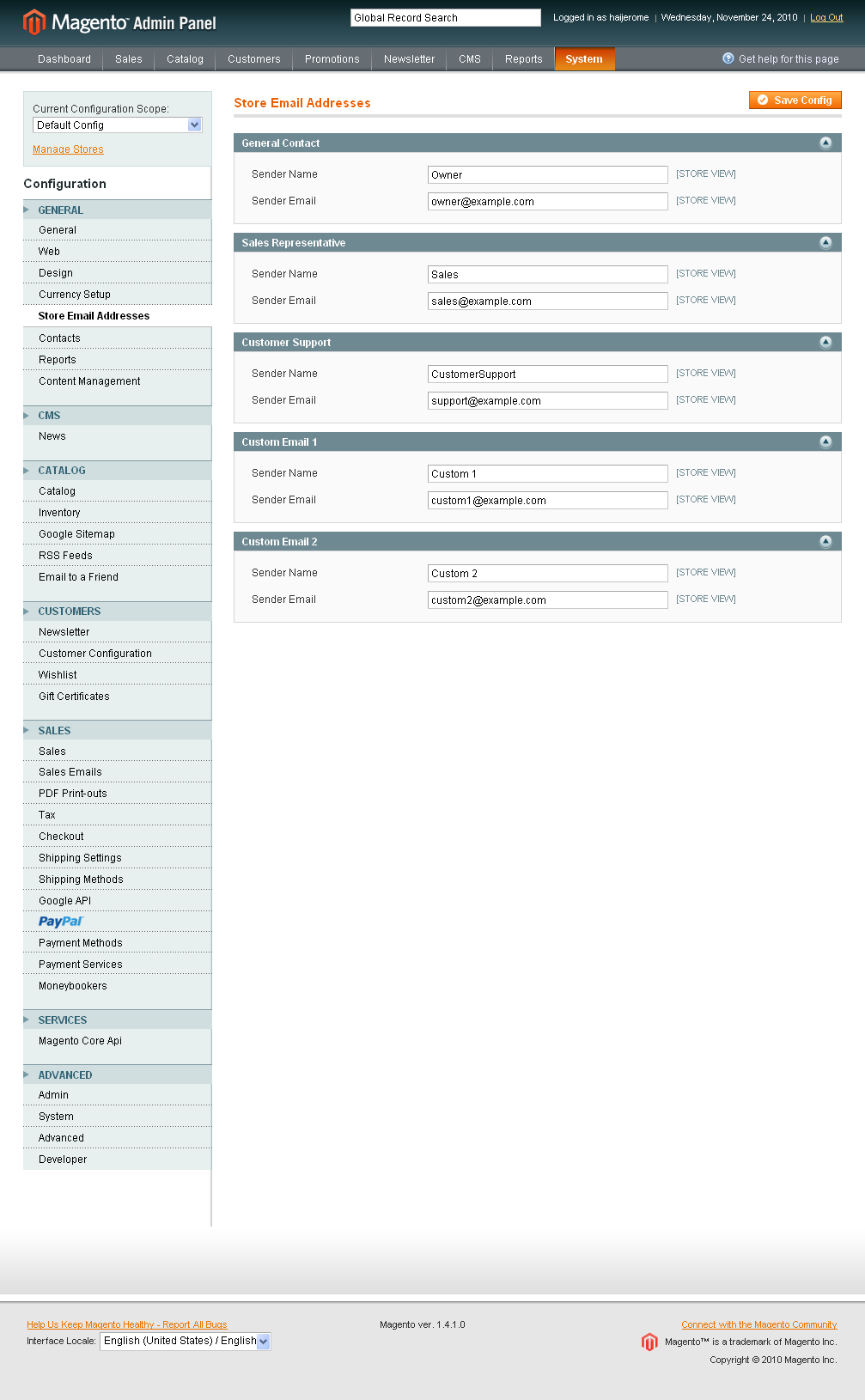 7. Its not over yet. So far we have created only a new email template for “forgot Password”. Still we have to assign this as the Forgot Email template instead of the default magento email template and change the email configurations. Lets see what we have to still to get our new email email template for forgot password. Click on both the links “Configuration” and “Customer Configuration” to change the Magento Email settings. At first let us see what we have to change in configuration. Go to System -> Configuration -> Store Email Addresses and change the email addresses for the General, Customer support etc.